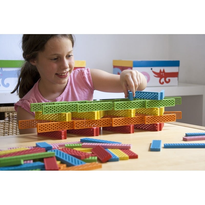 La Hello Box Bioblo.contient 100 briques à la forme alvéolée avec 5 coloris (rouge, jaune, vert, bleu, orange) et 20 pièces de chaque. Les enfants, dès 3 ans et leurs parents, vont pouvoir créer des constructions.