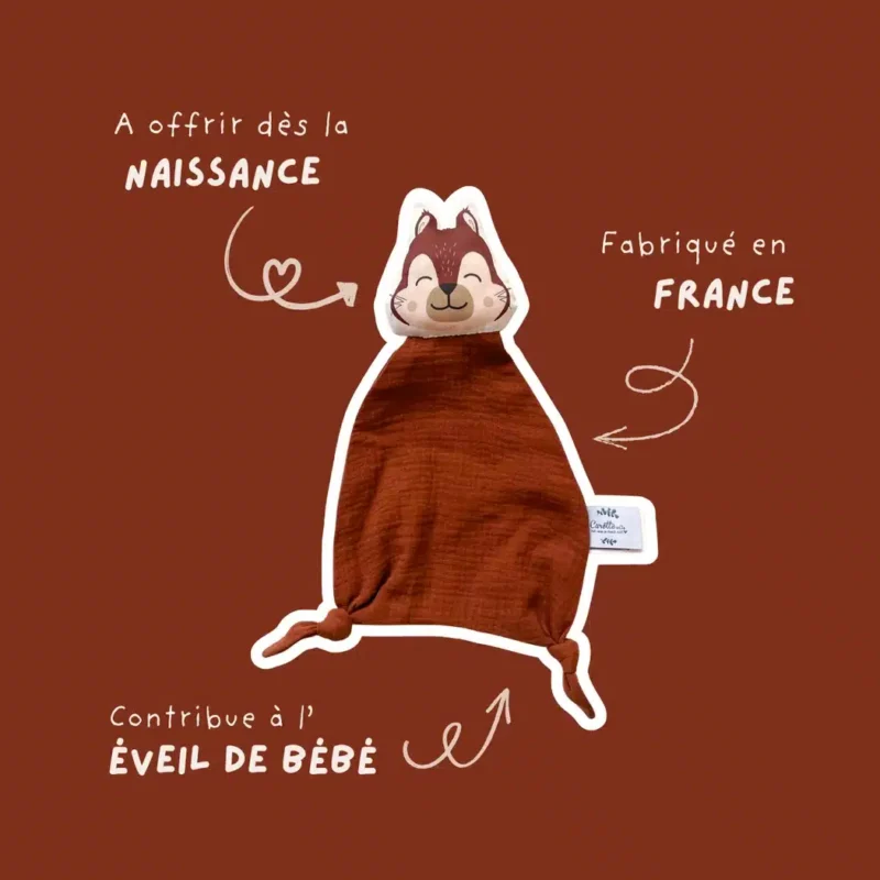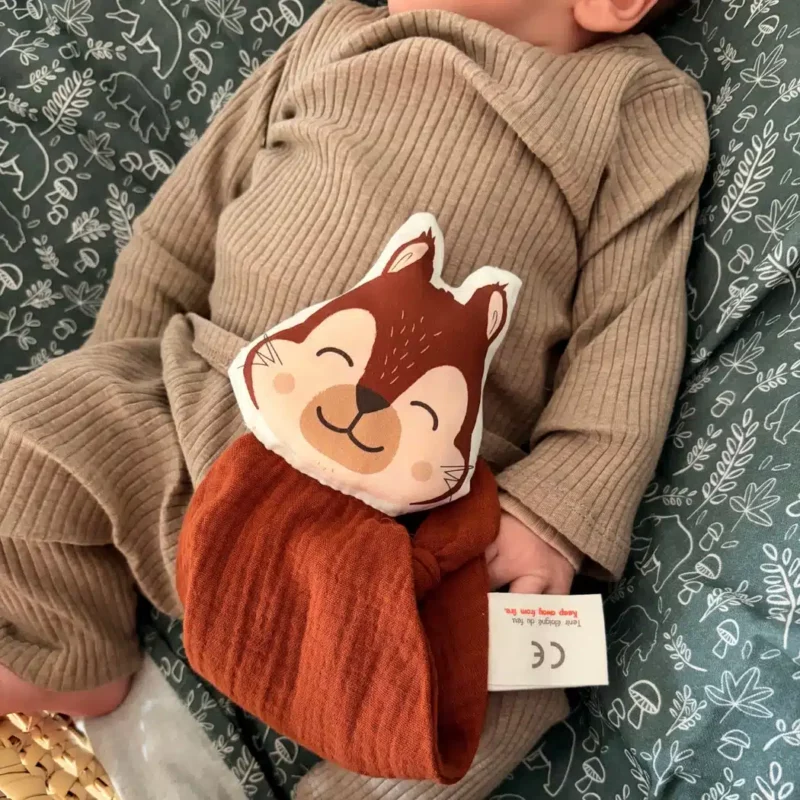 Joli doudou écureuil plat, compagnon idéal de bébé.