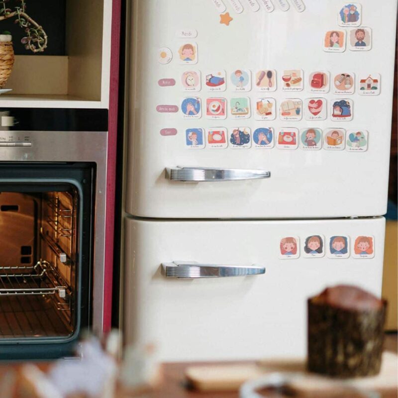 Pensé pour rester à portée de main (et d’œil), cette routine pour enfant trouve sa place sur le frigo, un tableau magnétique ou une porte métallique.