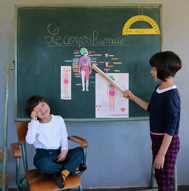 Les enfants explorent l’anatomie en reconstituant le squelette, en positionnant les organes à leur place et en apprenant à les nommer grâce aux étiquettes légendées.