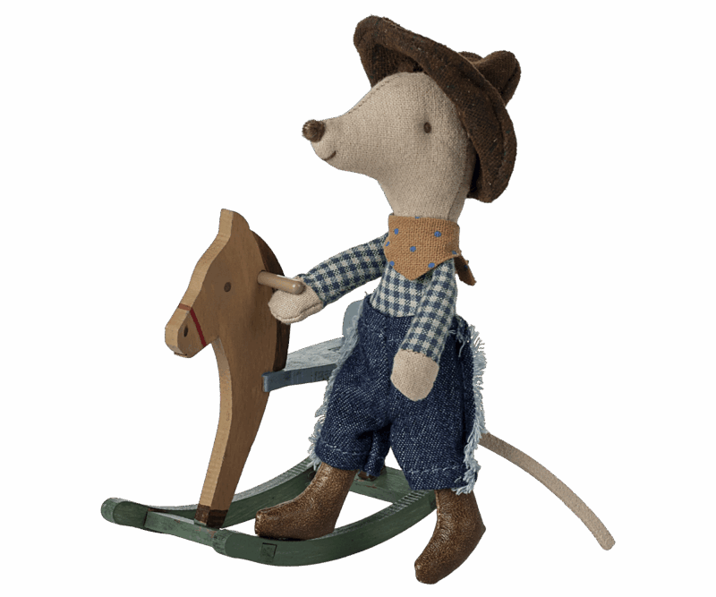 Une souris cow-boy avec des aimants dans les mains, habillée en jean, écharpe et chapeau, chevauche son cheval à bascule en bois.