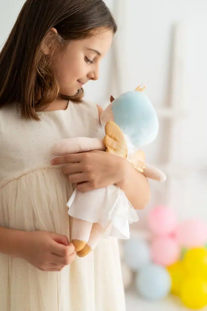 Douce poupée artisanale confectionnée en velours doux avec des détails délicats en tissus.