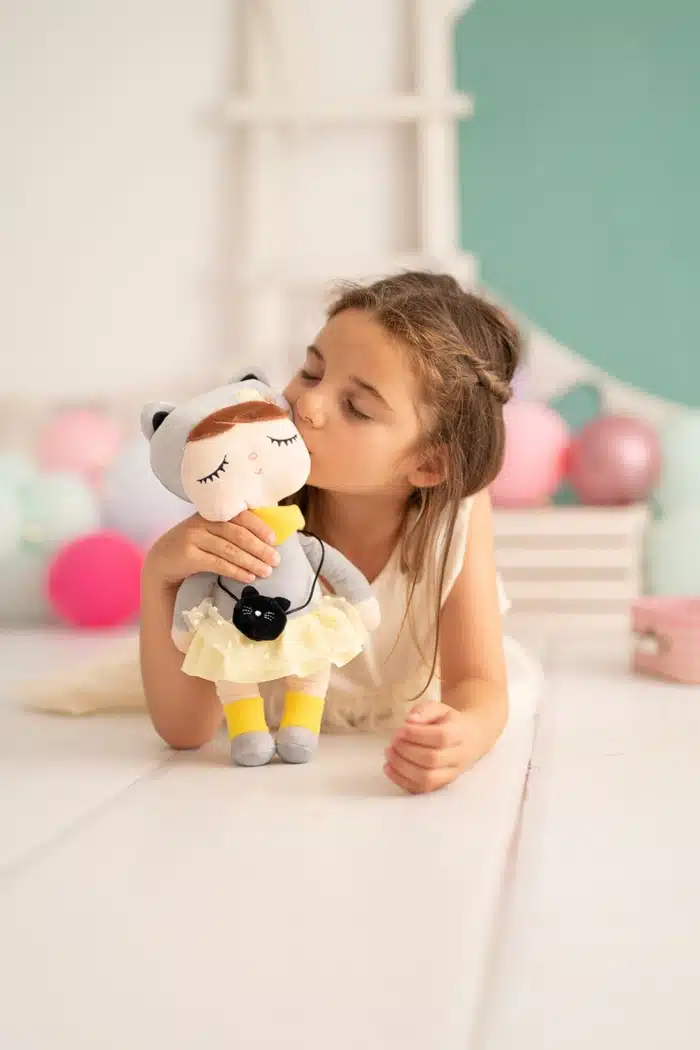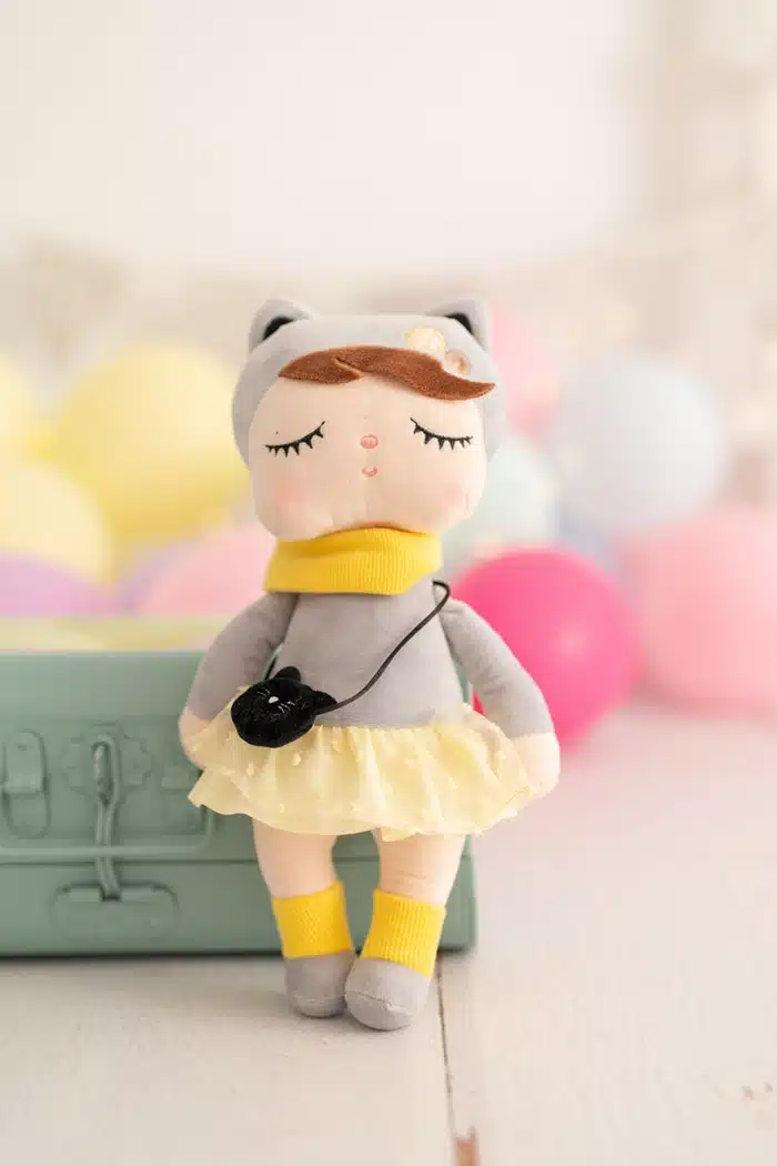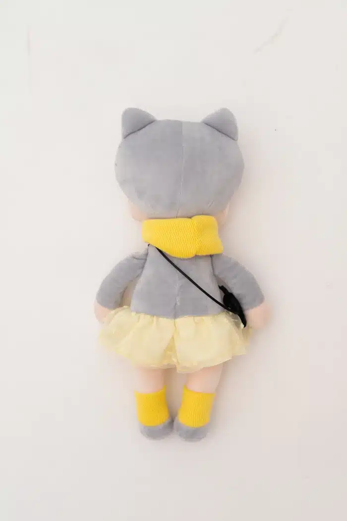 Son joli design avec un haut jaune/gris assorti à son bonnet, une jupe en tulle et un petit sac chat noir en fera la poupée inséparable de votre enfant.