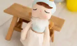 Douce poupée artisanale confectionnée en velours doux avec des détails délicats en tissus.